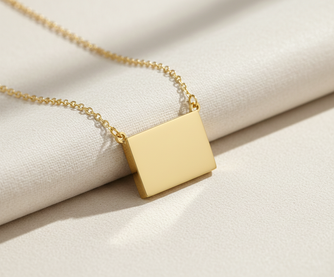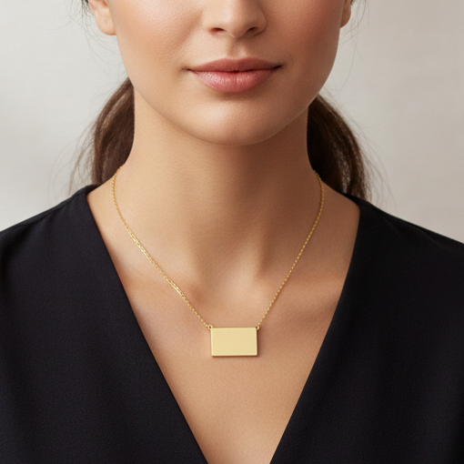 Minimalismo con un extra de versatilidad. La placa rectangular ajustable está pensada para que puedas adaptar la caída y crear distintos efectos: más pegada al cuello o un poco más larga según el look.