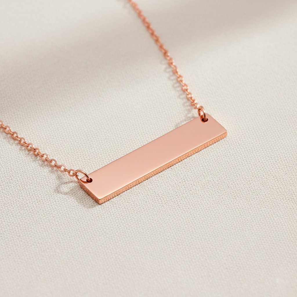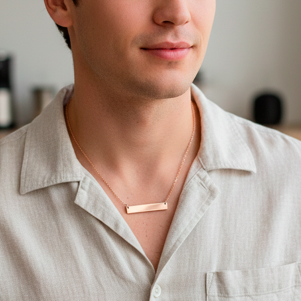 La placa rectangular es pura estética minimal: líneas rectas, caída limpia y un look moderno que combina con todo. Es el tipo de pieza que se convierte en fondo de joyero porque siempre encaja.